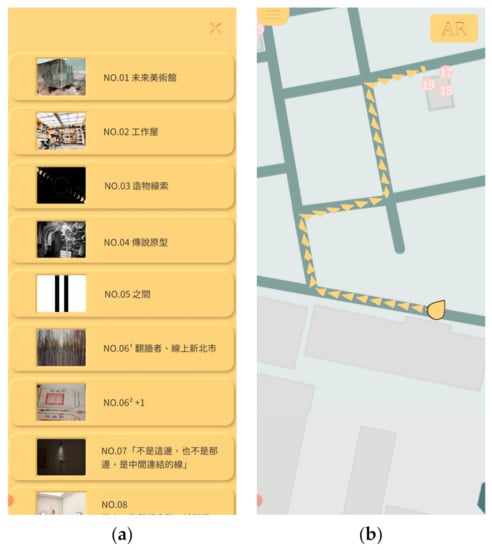 The free mode provided a general GPS location search and navigation function for each artwork. Visitors could decide which artwork they wanted to see (Figure 4a), and the system would show the shortest route to it (Figure 4b). Aside from providing introductions to the artworks, scanning the labels offered no rewards.