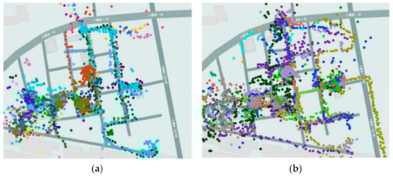 On the whole, analysis of the path data automatically uploaded by the smartphones of the participants revealed that the initial starting points of the participants were scattered, regardless of navigation mode. However, as shown in Figure 7, where each color indicates the path data of a single participant, the paths of the participants who used the game mode (Figure 7a) were more regular and consistent than those of the participants who used the free mode (Figure 7b), thereby showing that gamified navigation had a greater guiding effect.