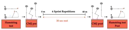 The study comprised a pilot familiarization test session with all the test protocols (i.e., sprint, CMJ, and Hamstring test), and a single evaluation session performed on the team’s own artificial turf training and playing field. All the participants used their appropriate personal footwear. The test session was on the same schedule to avoid detrimental performance effects associated with circadian rhythm [40] and took place in the middle of the season, specifically on Monday or Tuesday of the training week—depending on match intensity (i.e., there was always 24 h rest after the match for players who played more than 60 min). The sessions began with a 10-min general warm up, always guided by the club’s physical trainer, consisting of continuous running, specific running, joint mobility, and ballistic stretching exercises, and followed by a specific pre-test warm-up in which participants performed three progressive sprints with 30 s between each one. After a three-minute rest, the participants started the protocol consisting of an RSA test (6 × 40 m with 30 s rest between repetitions), and CMJ (with 30 s between trials) and Hamstring test before and after the RSA test (with 30 s between each test) (Figure 1).