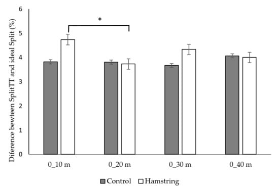 Percentage difference between SplitTT and Ideal Split: percentage difference between the time to run a specific number of splits and the time if these splits were run as the best of them. Control: Subjects without previous hamstring injury; Hamstring: Subject with previous hamstring injury. * Significant difference between 0–10 m and 0–20 m in the hamstring group considering the first 20 m of the sprints (p < 0.005).