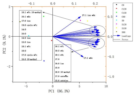 PCA was performed on the samples using the identified PLFAs at different periods before and after planting. Two principal components were extracted in this experiment, namely, the first principal component PC1 (86.3%) and the second principal component PC2 (9.1%), which explained 95.4% of the variability.