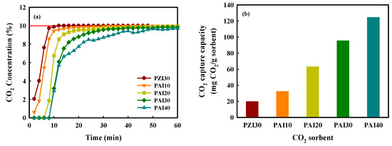 CO2 breakthrough curves (a) and CO2 capture capacities (b) of PZI30 and PAI10–40 sorbents according to K2CO3 loading at 20 atm.
