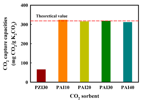Figure 2 shows the amount of CO2 sorption per 1 g K2CO3 as a function of the K2CO3 loading. The CO2 sorption per 1 g K2CO3 was calculated from the CO2 capture capacities of PZI30 and PAI10–40 sorbents, as shown in Figure 1. The CO2 capture capacities of PAI10–40 sorbents were maintained at approximately 311.2–323.1 mg CO2/g K2CO3. These calculated values corresponded to approximately 98–101% of the K2CO3 theoretical value of 318.4 mg CO2/g K2CO3. However, the CO2 capture capacity of PZI30 sorbent was approximately 65.7 mg CO2/g K2CO3, which is equivalent to approximately 26% of the K2CO3 theoretical value. The differences in the CO2 capture capacities of PZI30 and PAI10–40 sorbents mean that the CO2 sorbents can be absorbed through different reaction mechanisms.
