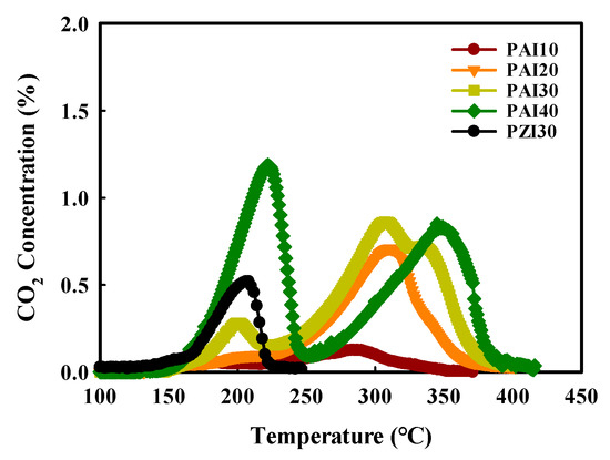TPD experiments of PAI10–40 sorbents were conducted to examine the regeneration properties under 20 atm, as shown in Figure 6. In addition, a test of PZI30 sorbent was conducted to identify the decomposition temperature of the KHCO3 structure at 20 atm. The CO2 desorption of PAI-x sorbents started at 150 °C, and the desorbed CO2 peak was observed in the temperature range from 150 °C to 400 °C. The TPD results of PAI10 and 20 sorbents showed one peak between 250 °C and 350 °C, and the TPD results of PAI30 and 40 sorbents showed two peaks between 150 °C and 400 °C. In the case of low K2CO3 loading such as PAI10 and 20, the CO2 peak was produced by the decomposition of the KAl(CO3)(OH)2 structure. In the case of high K2CO3 loadings such as PAI30 and 40 sorbents, the CO2 peak was produced by the decomposition of the KHCO3 and KAl(CO3)(OH)2 structures. Particularly, the KHCO3 decomposition of PAI30 and 40 sorbents appeared at the same temperature range as the PZI30 sorbent, and the CO2 peak caused by the decomposition of KAl(CO3)(OH)2 increased with increasing K2CO3 loading. The CO2 peak caused by KHCO3 decomposition also increased due to increased K2CO3 loading. Based on the TPD results, the alumina-based CO2 sorbent was confirmed to be capable of regeneration at temperatures below 400 °C at 20 atm. This study concluded that the potassium-loaded alumina-based sorbent had a higher CO2 capture capacity than the zirconium-based sorbent due to the high surface area of alumina and the KHCO3 and KAl(CO3)(OH)2 conversion. This means that these sorbents could be used as a support and additive to prepare a sorbent with the potential for CO2 capture and regeneration under high and moderate temperature conditions.