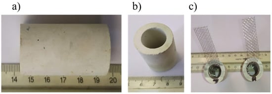 For the preparation of the ceramic cathodes, mullite tubes (Bonis S.A., Athens, Greece) (Figure 2a,b) with an outer diameter of 25 mm, a wall thickness of 2.5 mm and a length of 50 mm were used. Mullite tubes were used as the separators and as a structural support for the catalysts’ deposition. An acrylic-based binder (HSF54 paint, YSHIELD GmbH&Co. KG, Ruhstorf, Germany) and powdered activated carbon (Sigma-Aldrich, CAS 7440-44-0) were used as precursors for the production of the cathodic electrode catalyst. A stainless-steel grid was placed along the inner surface of the ceramic tube as the current collector before the application of the above techniques (Figure 2c).