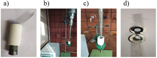 Sono-coat technique (SC): The slurry was poured up to the surface into the inner volume of the ceramic tube with a rubber cap at its bottom to prevent spilling (Figure 3a). A tip, producing ultrasound at the frequency of 20 kHz (Vibra cell 750, SONICS, USA), was placed 1 cm inside the tube. It was operated at 19% amplitude for 10 min (Figure 3b,c). After that time an ultrasound-assisted ceramic supported electrode was obtained, as depicted in Figure 3d.