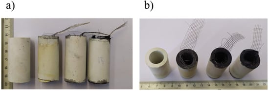 (a) Horizontal images and (b) vertical images of four mullite tubes with stainless steel mesh (left to right: blank, WC, BC, and SC).