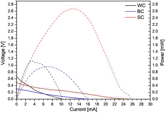 As can be seen from Figure 6, the maximum power output (2.67 mW) was obtained with the ceramic electrode produced with the SC technique. Additionally, the maximum power output for the MFC operation with the WC and BC electrodes was in the same range (WC: 1.12 and BC: 0.96 mW). Moreover, the slope of the V–I curves (Figure 6, continuous lines) indicated that ohmic losses dominated in the MFC, across the three electrode cases. Table 3 presents the open circuit values (OCV) and the maximum power output per catalysts mass and per volume of leachate, for the cycles’ operation with the different electrodes.