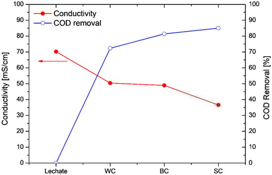 Figure 7 depicts the variations in the conductivity and the COD removal efficiency values at the end of each operation cycle in comparison with the initial values of the leachate: As can be seen from Figure 7, high COD removal efficiencies were achieved in all cases (COD removal > 70%), while the leachate conductivity decreased after its treatment. It is worth mentioning that the conductivity decreased by almost 50% when the wastewater was treated using the electrodes prepared with the SC technique. The conductivity decrease may be attributed to the decomposition of the substances present in the landfill leachate. The electrochemically active biofilm oxidizes the available substrate (leachate), decomposing the substances that contribute to the high conductivity, thus resulting in the decrease in the conductivity. A similar decrease in the anolyte’s conductivity has been observed elsewhere [36], although comparison between the two cases is difficult, due to the different acclimation, MFC set-up and feedstock conditions.