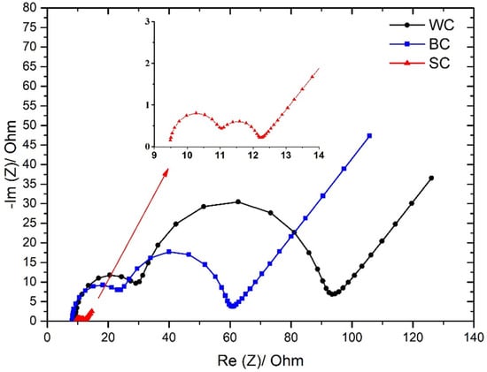 In order to perform a detailed electrochemical characterization of the cell with the different electrodes, EIS experiments were carried out. From the electrochemical point of view, as reported elsewhere [37,38,39], the internal resistances of the cells with different electrodes can be calculated. In Figure 8, the Nyquist diagrams show significant information for the electrochemical processes that occur during the simultaneous wastewater treatment and electricity production.