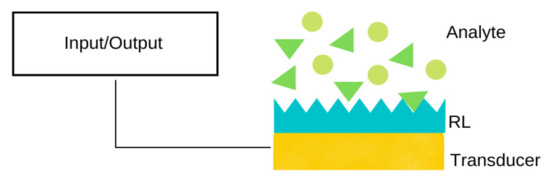 A biosensor is, generally speaking, a device composed of a receptor layer (RL) and a transducer, as schematically depicted in Figure 1. Upon contact with a solution of the target analyte (e.g., DNA, proteins, lipids, saccharides), it binds to the RL, and the transducer typically translates the event into an output signal, such as an optical, thermal, piezoelectric, electrochemical, or electrochemiluminescent signal, to name a few.