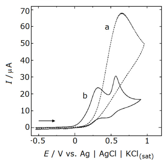 Cyclic voltammograms, at a potential scan rate of 100 mV·s⁻1, of a mixed solution containing 0.2 mM of ascorbic acid and 0.05 mM dopamine in 0.2 M phosphate buffer (pH 7): (a) bare BDD electrode and (b) oxidised polypyrrole film-coated BDD electrode. Reprinted with permission from Roy et al. [36]. Copyright 2004 Wiley-VCH Verlag Gmbh & Co. KGaA, Weinhelm.