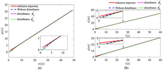 Straight-line trajectory tracking in three cases: (a) trajectory tracking in the xy plane; (b) trajectory tracking in the x-axis and the y-axis directions.