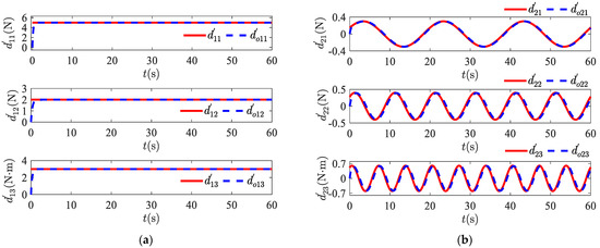 Disturbance observer simulation results: (a) actual values and observed values for constant disturbances; (b) actual values and observed values for time-varying disturbances; (c) constant disturbance errors; (d) time-varying disturbance errors.