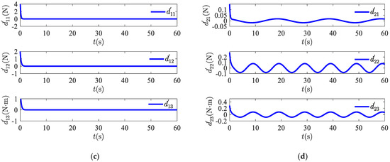 Figure 3 shows the observed curves and the observed error curves of the nonlinear perturbation observer for two different environmental perturbations and . It can clearly be seen in Figure 3a,b that the disturbance observer is able to quickly approximate the external unknown environmental disturbances. Figure 3c,d show the errors between the actual disturbances and the observed values, showing that the designed disturbance observer for both the constant disturbances and the time-varying external environmental disturbances is able to estimate the actual disturbance values quickly and accurately. Therefore, the disturbance values observed by the disturbance observer can be used to replace the disturbances caused by wind, waves, and currents in the external environment, thus improving the robustness of the system.