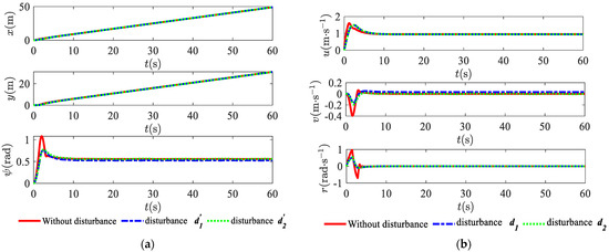 Figure 2a shows the straight-line trajectory curve of the underactuated USV without any disturbances, with steady disturbances , and with time-varying disturbances . The solid line is the reference trajectory curve, and the three dotted lines are the actual trajectory curves of the USV under different conditions. From the figure, it can be seen that with the control strategy proposed in this paper, the USV is able to overcome the influence of external environmental disturbances and track a straight trajectory in three different cases. Figure 2b represents the curves of the USV in the plane, the surge (axis direction), and the sway (axis direction) positions over time. It can better reflect the change of the trajectory over time. It can be seen from the figure that the USV tracks the reference trajectory in a very short period of time and maintains stable tracking at all times. Since the USV is underactuated and has no thrusters in the sway direction, it can be seen from the figure that it takes more time to track the reference curve in the axis direction than in the axis direction.