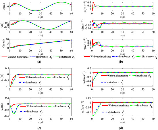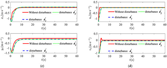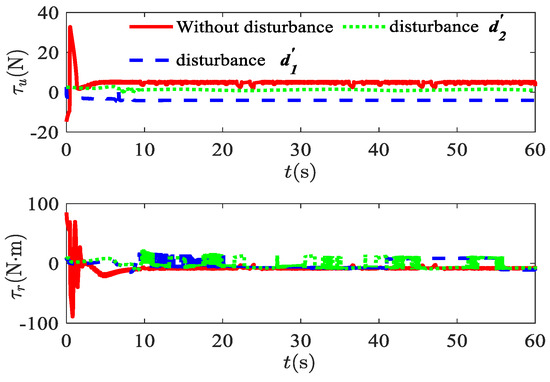 Figure 4a,b show the actual position variation curves and the actual velocity variation curves of the USV, respectively, in the three cases. As can be seen from the figures, the position and speed curves under the effect of disturbances have the same pattern as those without disturbances, which further indicates that the controller has an excellent anti-disturbance capability. Figure 4c,d show the position error variation curve and velocity error variation curve of the USV, respectively, in the three cases. The position and velocity error curves more clearly reflect the USV tracking reference trajectory. As shown in the figures, there is a large error at the initial stage of navigation, but after a period of intervention both the position error and velocity error approach zero, which shows that the designed controller can effectively track the linear reference trajectory. Figure 5 shows the variation curves for the surge force and yaw moment. The output curve of the controller becomes a smooth curve, maintaining tracking with a short adjustment time.