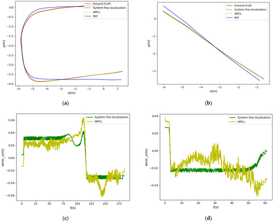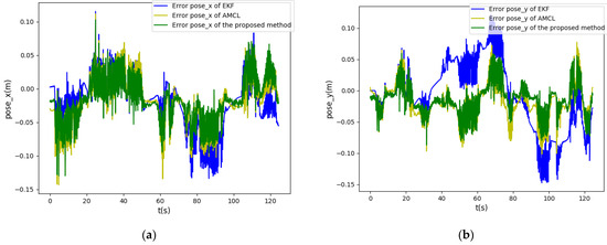 In case 2, the pose estimation and the pose errors of EKF, AMCL, and the algorithm proposed in this paper are shown in Figure 12. It can be seen from Figure 11 and Table 2 that when the error of the wheel odometer and the IMU is large, the correlation sampling algorithm proposed in this paper and AMCL algorithm can also achieve high accuracy, which is the same as the conclusion of case 1. At the same time, we can also find that when the IMU and the wheel odometer errors are large, the accuracy of the pose tracking based on the AMCL algorithm will be slightly increased, but the method proposed in this article has basically no effect. In practical applications, the error of the IMU and the wheel odometer is inevitable, and the method proposed in this paper can still keep the accuracy unaffected or less affected, which is one of the major advantages of the algorithm proposed in this paper.