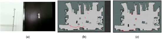 The test results show the system’s excellent precision relocation capabilities. For example, in test positions 1 and 9 facing the door, the image information obtained by the camera was very similar, and position 9 also contained chaotic environmental parts. The position of the two doors and the chaotic part are shown as A, B, and C in Figure 18a. However, the algorithms can successfully complete precise relocation, showing excellent precise relocation capabilities and the relocation process is shown in Figure 19.
