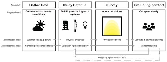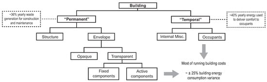 The concept of a building was initially used to identify a human shelter (i.e., enclosure) that protects its occupants from weather, and is built for security as a livable and private space. The understanding of the concept was later expanded to also include the notion of a comfortable living and working space. Nevertheless, the notion of comfort has been interpreted in numerous ways. In the beginning, the building was understood as somewhere that had sufficient weather protection and security from any outdoor threats, and later evolved into a healthy space in an unperturbed state; thus, making the indoor environment the space where humanity spends most of its time (>80%) [1,2]. The indoor environment can be categorized as an anthropogenic artificial habitat, in which, at least to some degree, its conditions can be continuously monitored by sensors and controlled by integrated building systems. These conditions were envisioned to promote comfort, health, and well-being for most building occupants. Consequently, ranges of physical parameters that describe the indoor environment (i.e., air temperature, air humidity, illuminance) were established in such a way that, if respected, would guarantee satisfactory indoor conditions, promote the reduction of undesired human body responses (e.g., onset of sick building syndrome) and enhance occupants’ quality of life [3,4].