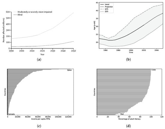 World’s population differences probably affecting indoor comfort perception. In particular, that could skew the results obtained through qualitative questionnaires. (a) Eye-sight affections (extracted from [53]). (b) Population average world’s age trend; (c) Projected 2020’s per capita Purchasing Power Parity (PPP) differences; and, (d) 2011’s Percentage of adult literacy breach based on free material from GAPMINDER.ORG (accessed on 23 December 2019), CC-BY LICENSE.