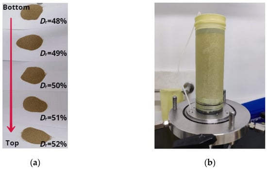 - In the test, the sample mass of the dry sand was divided into five parts and the relative density of the lower layer is 1% lower than that of the upper layer. For example, to prepare a specimen with a relative density of 50%, the relative density of the five layers from bottom to top is 48%, 49%, 50%, 51% and 52%, respectively, as shown in Figure 2a;
