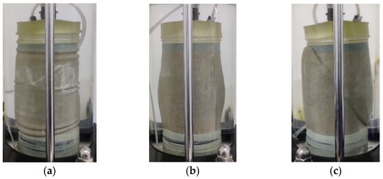 The deformation of specimens at the end of shear under undrained condition. (a) σ3′ = 300 kPa, Dr = 10%; (b) σ3′ = 300 kPa, Dr = 50%; and (c) σ3′ = 300 kPa, Dr = 90%.