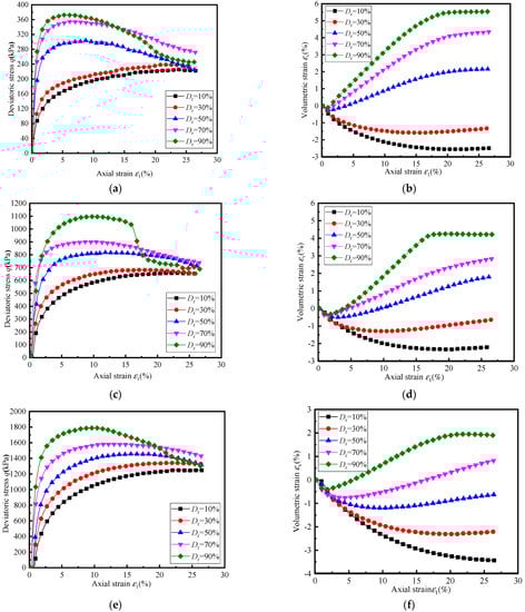 Deviatoric stress-axial strain-volumetric strain behaviour of the aeolian sand under drained condition. (a,b) σ3′ = 100 kPa; (c,d) σ3′ = 300 kPa; and (e,f) σ3′ = 600 kPa.
