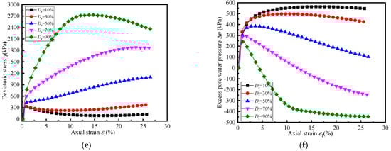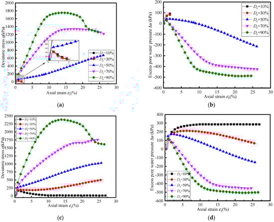 In this test, five different relative densities were designed, such as 10%, 30%, 50%, 70%, and 90%, covering loose sand, medium-dense sand, and dense sand. The drained and undrained tests were carried out, respectively, under effective confining pressures of 100 kPa, 300 kPa, and 600 kPa. Under the condition of high load, the aeolian sand needs to be treated for the subgrade, and the results of the high confining pressure test have a certain reference value for the construction. At the same time, sand shows different characteristics under high confining pressure and low confining pressure [42], which is mainly due to the anisotropic evolution caused by dilatancy, particle fragmentation, and rearrangement of the sand specimens. Therefore, the undrained tests with higher confining pressure (800 kPa and 1200 kPa) and lower confining pressure (50 kPa) are designed for medium-dense sand to fully understand the mechanical properties of aeolian sand.