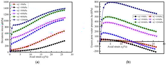 Dr = 50%, deviatoric stress-axial strain-excess pore water pressure behaviour of the aeolian sand under undrained condition. (a) The deviatoric stress-axial strain curves; (b) The excess pore water pressure-axial strain curves.