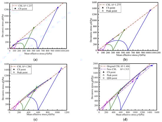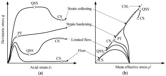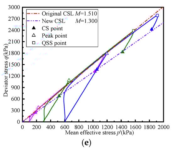 For the aeolian sand, the q-ε1 curves and the effective stress paths under undrained loading conditions in triaxial stress space exhibit four types of undrained behaviour, such as flow, limited flow, strain hardening, and strain softening as illustrated in Figure 8. In flow behaviour, the q reaches a peak value and then strain softens to the critical state (CS) at dq = 0, dp’ = 0, and du = 0; where p’= (σ1′ + 2σ3′)/3. In limited flow, after the initial peak, q drops to a transient stable value at the quasi-steady state (QSS), and the subsequent shear makes q increase again approach to the critical state. For strain hardening behaviour, the dq ≠ 0, dp’ ≠ 0, and du ≠ 0, indicate that critical state has not been reached. However, the effective stress path has reached the critical state line (CSL). The transformation of the specimen from contraction to dilatancy is called phase transformation (PT). In strain hardening behaviour, the effective stress path turns to the right at phase transformation (PT). For the strain softening behaviour, q increases to a high transient stable value at the quasi-steady state (QSS), after which shearing causes q to suddenly decrease to the critical state, which is contrary to limited flow behaviour. In the q-p’ plane, the effective stress path rises from the initial stress point to the original critical state line and moves upward along the original critical state line. After reaching the peak strength, it drops and converges to the new critical state line. The reason for the sudden stress drop is because there should be a shear band during the shearing of the specimen (Figure 4c).