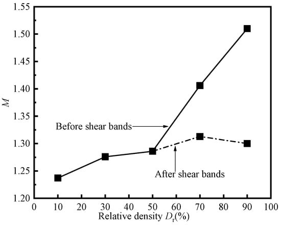 The effective stress path curves of aeolian sand specimens under drained and undrained conditions are shown in Figure 9. The points at the end of shearing for aeolian sand specimens are taken as the critical state points to estimate the critical state line in the q-p’ plane, which is represented by a solid symbol in the figure. Under drained conditions, medium-dense sand and dense sand generate strain softening, the hollow symbol is used to represent the peak stress. Some tests do not arrive at critical state, the hollow symbol is also used to represent the peak stress. All tests on aeolian sand yielded CS points in the q-p’ plane that can be fitted with a straight line passing through the origin with a slope of M. Remarkably, for loose sand as shown in Figure 9a, the peak stress does not reach the critical state line, but a smaller stress when the critical state line is reached. For the dense sand, it can be seen from Figure 9d,e that the effective stress path of the specimens drop away from the critical state line after passing through it, which indicates that the specimen has been destroyed and obvious shear band generate at the same time. So there are two critical state lines for dense sand, which are the original critical state line (Original CSL) before the shear band and the new critical state line (New CSL) after the shear band, as shown in Figure 9d,e. It is worth noting that for the loose sand, the peak strength line, the phase transition line, and the critical state line overlap into one line. However, for the dense sand, the peak strength line coincides with the original critical state line, and the phase transition line coincides with the new critical state line. Figure 10 shows the relationship between the M value and relative density. The figure shows that the M value increases with the increase in relative density, and the generation of shear band has great influence on the strength of aeolian sand.