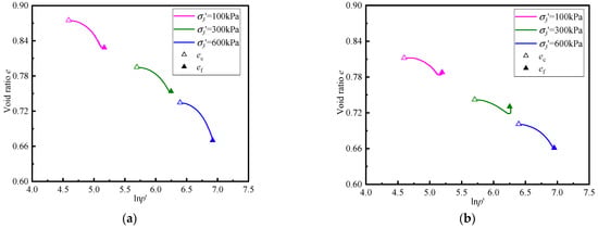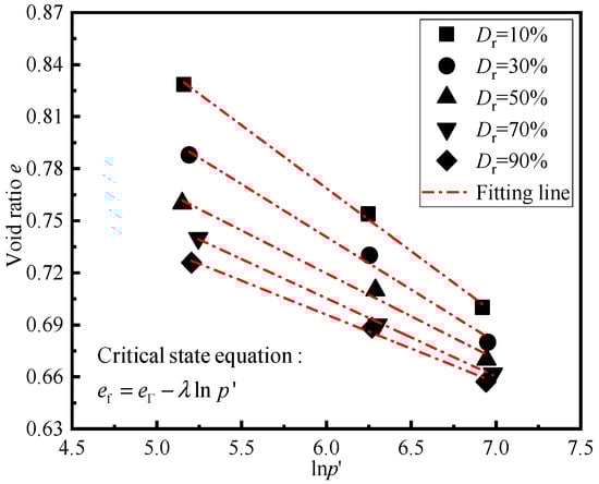 The critical state lines in e-lnp’ plane for aeolian sand specimens are approximated by fitting the critical state points obtained from drained tests, as shown in Figure 12. The linear form of the critical state line (CSL) is considered here to better reflect the aeolian sand specimens in the e-lnp’ plane, which is expressed as: