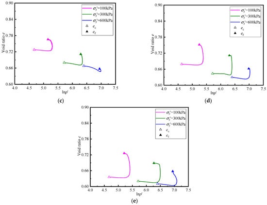 The stress paths in the e-lnp’ plane of aeolian sand. (a) Dr = 10%; (b) Dr = 30%; (c) Dr = 50%; (d) Dr = 70%; (e) Dr = 90%.