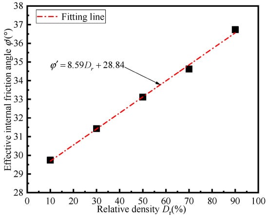 The effective internal friction angle of aeolian sand can be obtained by the Mohr stress circle envelope. Since the stress-strain relationship of aeolian sand has no obvious peak when the relative density Dr = 50%, the deviatoric stress at 15% axial strain is taken as the failure point. Through this method, the effective internal friction angle of aeolian sand with different relative densities can be obtained as shown in Figure 13. It can be seen from Figure 13 that the effective internal friction angle of aeolian sand increases approximately linearly with the increase in relative density of specimens, which can be fitted by a straight line as: