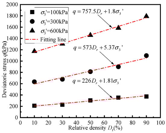Figure 14 shows the relationship between effective internal friction angle and confining pressure of aeolian sand with relative density Dr = 50% under undrained conditions. It can be seen from Figure 14 that the effective internal friction angle decreases with the increase in confining pressure. A plot of the observed values of peak q and Dr are shown in Figure 15. Similarly, the peak q with Dr can be fitted by a straight line: