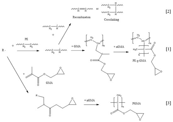 PE-g-GMA is synthesized via radical polymerization [3,5,6,7,9,10,11,14,33]. Radicals are formed after the thermal decomposition of the peroxide and these formed radicals can react via several pathways (Figure 2).