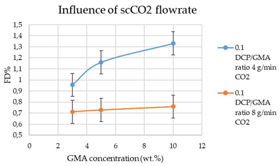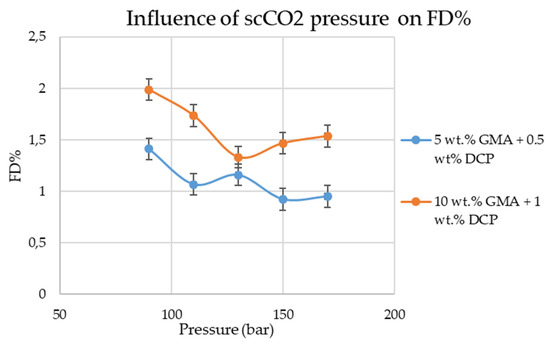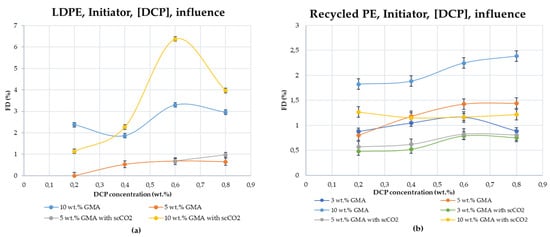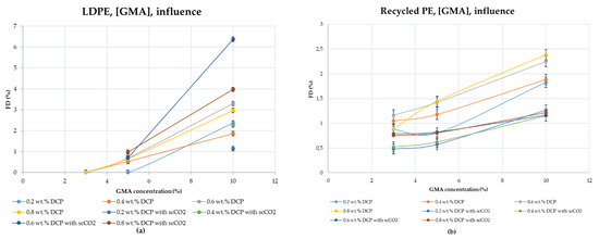 The use of scCO2 gave different results for the two types of PE used, as shown in Figure 2 and Figure 3. ScCO2 had a positive impact on the FD for the PE-g-GMA (0.6 wt.% DCP and 10 wt.% GMA) prepared with LDPE, reaching an FD of 6.3% compared to 3.2% without the use of scCO2. Nevertheless, the influence of scCO2 was more significant at higher concentrations of GMA compared to the results of Dorscht et al. (2002) [37] and Cao et al. (2010) [29].