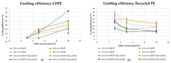 This was in agreement with literature-based expectations because a larger amount of GMA monomers allows more molecules to be grafted onto the matrix and less active sites are available for the crosslinking of PE [11]. The grafting efficiency increased with the DCP intake for the LDPE, according to Figure 5a. However, the GMA grafting efficiency declined significantly for RPE, according to Figure 5b. It was assumed that GMA homo-polymerization may exceed GMA grafting in reaction rate with the increase in the monomer concentration. As a result, the efficiency decreased in the grafted GMA based on initial GMA concentration. These observations were also made in other grafting studies [6,7,9,10,11,33].