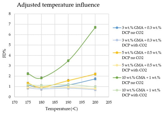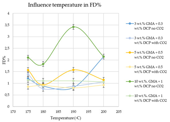 Again, the highest FDs obtained at 190 °C and 200 °C were achieved for the samples not treated with scCO2. The reason why higher temperatures resulted in a decrease in FD might be that the processing temperature exceeded the ceiling temperature of the GMA (150–220 °C). At higher temperatures, the polymerization of GMA becomes reversible. Moreover, the residence time was set to 20 rpm, which is not the most suitable time for all the different temperatures due to the different half-life times of DCP at different temperatures.