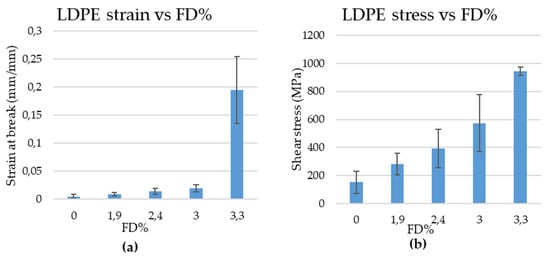 Strain (a) and stress (b) at break for grafted LFPE samples with different FD.