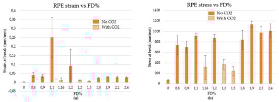 On the other hand, scCO2 had a negative impact on the FD for all the RPE-grafted samples, as can be seen in Figure 2 and Figure 3. According to the gel content measurements with toluene, using higher concentrations of DCP favored a crosslinking instead of a grafting reaction. This observation was also reported by Zhou et al. (2017) [38], where an increase in the DCP concentration increased the gel content in HDPE. Furthermore, Hwang et al. (2012) [39] studied the use of scCO2 during a reactive extrusion of PP/polystyrene blends and noticed that chain scission reaction by peroxides became more prominent at high DCP levels. This might also have occurred during our process, in which the use of scCO2 during the reactive extrusion probably further enhanced the crosslinking effect and, therefore, resulted in lower FD values.