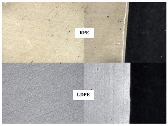 On the other hand, the difference in the composition led to the different viscosity of the melt. The rheology measurements pointed out that the viscosity of the RPE was six times higher than that of the LDPE at 130 °C. This high viscosity led to insufficient mixing in the extruder and favored the cage effect, which may explain the lower FD [14]. The exact reason for this difference is that viscosity was yet to be found. However, it probably stemmed from the post-consumer nature of RPE and the presence (vide supra) of different contaminants.
