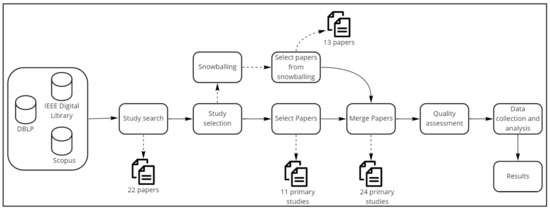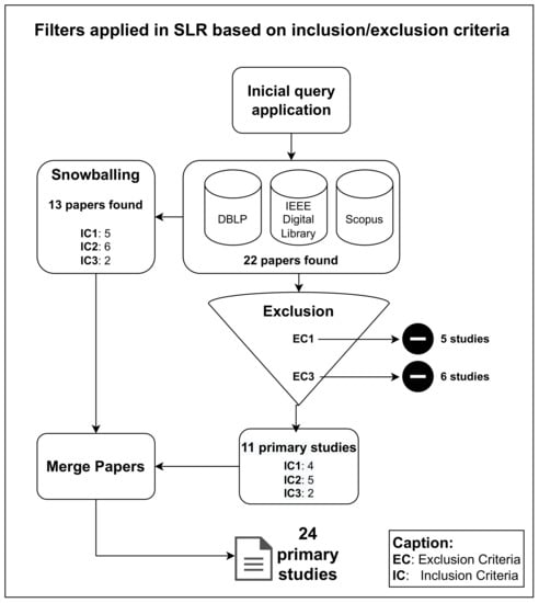 This section presents the results of performing the systematic literature review. Figure 1 shows the complete execution process of the proposed protocol to execute the SLR, with the respective quantity of studies identified in each step of the protocol. In the automatic search performed in the digital databases using the initial query, 22 papers were found. These studies were submitted to the snowballing process, resulting in 13 new selected papers. Of the 22 papers found initially, 11 were eliminated due to the exclusion criteria (5 studies that do not address the research object and 6 duplicate). Thus, 11 primary studies were selected from the digital databases and 13 studies on snowballing execution, totaling 24 primary studies. The selected primary studies are shown in Table 1. The filters applied during the SLR based on inclusion and inclusion criteria are demonstrated in Figure 2.