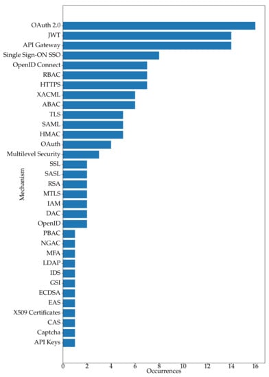 The mechanisms identified in the literature used to deal with authentication and authorization challenges in microservices architecture are presented in Table 5. The OAuth 2.0 protocol was the most mentioned (16 mentions), followed by JWT (14 mentions), API Gateway (14 mentions), Single Sign-ON (8 mentions) and OpenID Connect (7 mentions). Figure 3 shows the number of occurrences of the mechanisms used in the selected studies. Some mechanisms were used in only one study. It is important to emphasize that, in general terms, the identified mechanisms do not need to be implemented in a unique way, that is, they can coexist in the same environment, each one acting with a specific purpose. We identified in the selected studies some implementations in which the mechanisms act together, to mitigate possible vulnerabilities involving authentication and authorization in the microservices environment. It important to observe that some studies only point the mechanisms without explain deeply or demonstrate a practical implementation of them, such as the work of Pereira-Vale et al. [28], which is more concerned in perform a systematic mapping of security mechanisms.