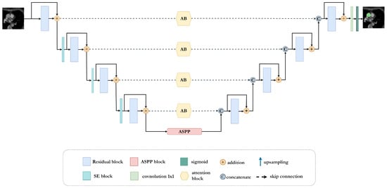 The proposed AB-ResUNet+ architecture consists of one stem block and three encoder blocks, ASPP and three decoder blocks. The encoder consists of squeeze-and-excitation and residual blocks, i.e., two successive convolutional layers and identity mapping. Each convolution layer includes an ReLU activation layer and batch normalization. The identity mapping connects the input and output of the encoder block. The output of the residual blocks in the encoder part is routed through the squeeze-and-excitation block to increase the representational power of the network. The main improvement is mainly achieved by adding the channel attention block into the skip connection. The addition of the channel attention block in each skip connection improves the coding ability in each layer and successfully eliminates irrelevant and redundant information. This improves the network’s ability to distinguish between feature importance and focus on the most important features. The ASPP block is placed at the bottom of the network and acts as a bridge between the encoder and the decoder, increasing the field of view of the filters and allowing them to include a wider context. The decoder consists of residual blocks, a convolution with sigmoid activation, that provides the final segmentation map. An illustration of the proposed network is shown in Figure 1.