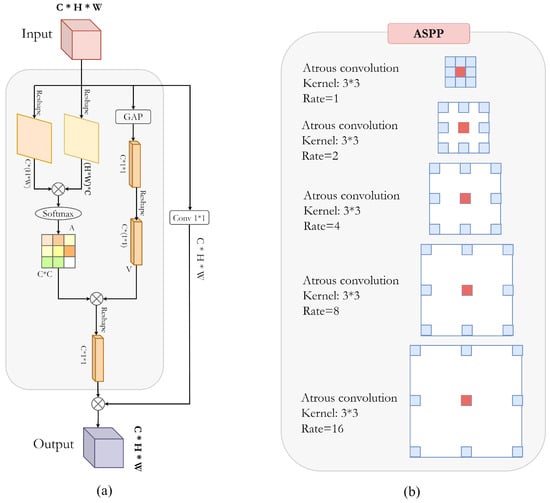 Convolution is an essential step in both CNN and FCN models, as it allows models to learn increasingly abstract feature representations. However, the pooling operations and the convolution steps between layers in the convolution process reduce the spatial resolution of the feature map, resulting in a loss of spatial detail. To learn the contextual information at multiple scales, dilated or atroid convolutions [,,] are introduced. They are able to increase the receptive field and maintain the resolution of the feature map by injecting holes into the standard convolution. Compared to the original standard convolution, the dilation convolution has a hyperparameter called dilation rate, which refers to the number of intervals of the convolution kernel. The idea of capturing contextual information at different scales subsequently led to the ASPP module [,]. Here, a large number of parallel atrous convolutions with different rates are fused together in the input feature map to control the field of view and accurately capture information at different scales []. The most prominent network that uses dilated convolution is DeepLabV3 []. This network combines the contextual information at multiple scales by fusing the lower and upper layer features. In addition, PSPNet18 [] uses a pyramid pooling module that aggregates contextual information of different grid scales to improve the ability to obtain global information. In DeconvNet [], stacked deconvolution layers are used for full resolution recovery. However, this results in a large number of parameters and can lead to difficulties in training.