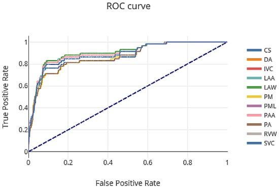 The ROC curve showing the tradeoff between sensitivity and specificity of our proposed AB-ResUNet+ network architecture is shown in Figure 4. The area under the ROC curve (AUC) for CS, DA, IVC, LAA, LAW, PM, PML, PAA, PA, RVW, and SVC were 0.74, 0.96, 0.91, 0.90, 0.81, 0.75, 0.72, 0.94, 0.93, 0.90, and 0.95, respectively. From the ROC curve, we can see that DA, PA, and SVC obtain a significant altitude, which is reflected in a very robust segmentation performance.