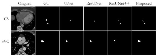 Nevertheless, while observing obtained segmentation predictions, we found some cases of missing or wrong segmentation results. A missing segmentation refers to an incomplete segmentation, i.e., when part of the area to be segmented is missing. This is a common problem in small structures such as CS, PML, and SVC. In particular, since the mask of PML is represented almost as a single point, the model could not segment it completely in case of any segmentation failure. An example of incorrect segmentation of CS and SVC can be found in Figure 6.