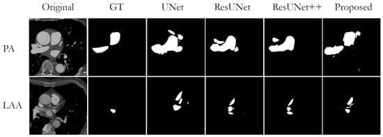 The proposed approach was compared with other similar deep learning approaches in terms of image segmentation accuracy, as shown in Table 7. The most similar work, regarding observed structures, to our work is work by Baskaran et al. []. They used UNet architecture for PAA, DA, SVC, IVC, PA, CS, RVW, and LAW segmentation. Nevertheless, their dataset consisted of 206 patients with 2D images of size , which contributed to high accuracy. Moreover, they used CAT images. The use of contrast and ECG gating that may have better delineated the border between the vessel wall and lumen may be partly attributable to higher DSC regarding PAA and DA segmentation. Another approach introduced by Jin et al. [] uses fully convolutional neural networks (FCNs) with three-dimensional (3D) conditional random fields (CRFs) for LAA segmentation. After manual localization of LAA, they employed the FCNs and fine-tuned them to segment each 2D LAA image slice. Further, they used a dense 3D CRF to refine the segmentations of all slices. Noothout et al. [] proposed a method for DA and AA segmentation low-dose chest CT without contrast enhancement. They used a dilated convolutional neural network (CNN) that classifies voxels in axial, coronal, and sagittal image slices. The probabilities of the three planes were averaged per class and voxels were subsequently assigned to the class with the highest class probability to obtain final segmentation. Furthermore, Shi et al. [] proposed a probabilistic deep voxelwise dilated residual network named Bayesian VoxDRN that can predict voxelwise class labels with a measure of model uncertainty. By utilizing the dropout process, the model is able to learn weight distributions with a higher degree of data explanation. This considerably reduces the likelihood of overfitting.